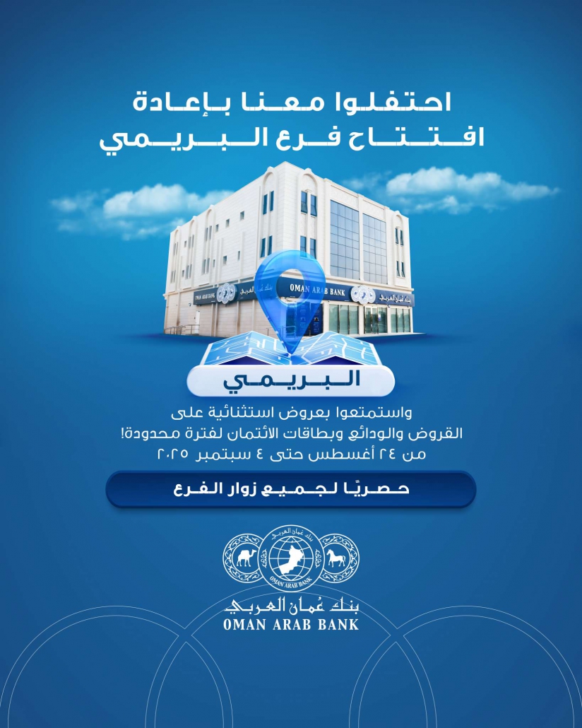 تُعدّ هذه المبادرة امتدادًا لاستراتيجية بنك عُمان العربي الشاملة في مجال الخدمات المصرفية للأفراد، والتي تهدف إلى تعزيز حضوره في مختلف فروعه على مستوى السلطنة، إلى جانب مواصلة الارتقاء بتجربة العملاء من خلال تطوير القنوات الرقمية وتحسين جودة الخدمة داخل الفروع. ويدعو البنك عملاءه في منطقة البريمي إلى الاستفادة من هذه الفرصة المحدودة، والتعرّف عن قرب على المرافق المطوّرة والخدمات الجديدة التي تم تصميمها لتلبية تطلعاتهم المصرفية.